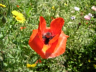 If your kernel is an entire box filled with the same value (with appropriate scaling factor so all elements sum to 1.0), then the blur is called a box blur. If you want a very large box blur, then the naive convolution code in this tutorial is too slow. But you can implement it easily with a much faster algorithm: Since every value has the same factor, you can go loop through the pixels of the image line by line, and sum N values (with N the width of the box) and divide through the appropriate scaling factor. Then for every next pixel, you add the value of the next pixel that appears in the box, and subtract the value from the leftmost pixel that disappears from the box. After doing this for each scanline horizontally, do the same vertically (to optimize use of the CPU cache, when doing it vertically, ensure that you still implement it in such way that you still operate in scanline order in practice rather than per columns, so store a sum per column). This all requires care with how you treat the edges (where the box is partially out of bounds) and the case where the image is smaller than the box. No code is given here as it goes a bit beyond the scope of this tutorial.
