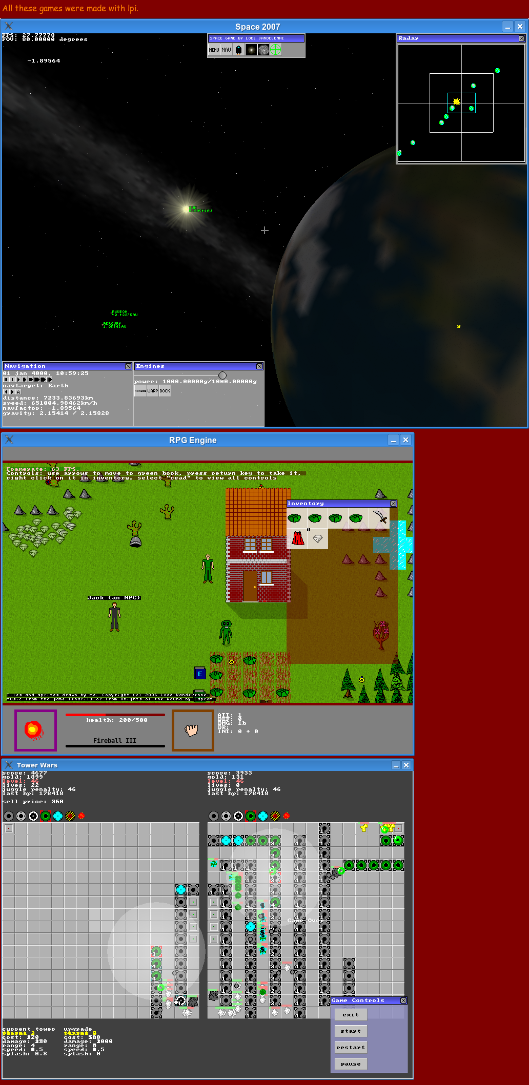 lpi, or Lode's Programming Interface, is game programming toolkit wirtten in C++, that uses SDL and OpenGL.