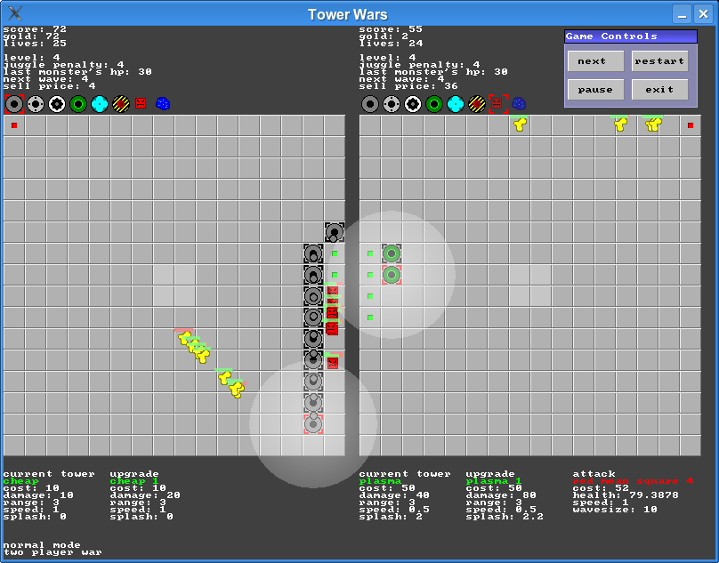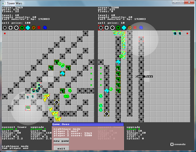 Torenoorlog a tower defense game for two players. Two people can play on 1 computer and compete against each other, building towers to defend against waves of monsters, or using the money to send extra monsters to the opponent instead.