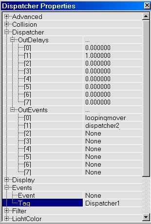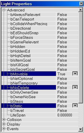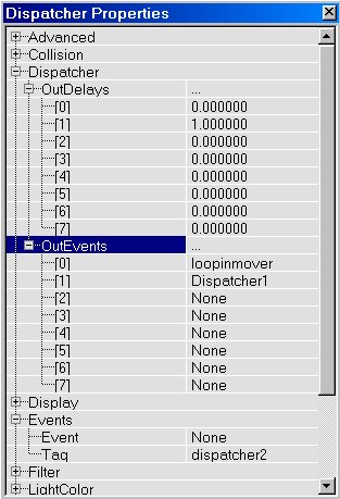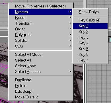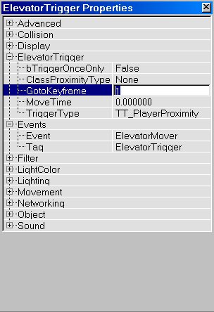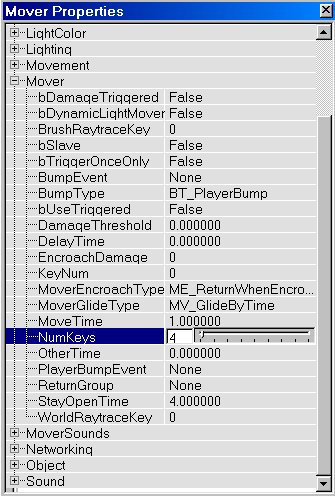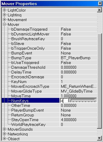 The lift and doors you just created use only 2 keys: Key0 (base) and Key1. You can also make movers with more than 2 keys, with a maximum of 8 keys. If you make such a mover with for example 4 keys, it will, when activated, move from Key0 to Key1, then to Key2 and then to Key3. There it will wait for a few seconds, and then it will return to Key2, then to Key1 and then back to Key0 where it will wait until it is activated again. To give a mover multiple keys, do the same as you did with Key1 in the lift example, but this time do it for Key2, Key3, etc... as well. But that's not all, you also have to tell the mover how many keys you want it to use. Right click on the mover and choose "Mover Properties". In the window that appears, expand "Mover" and there set NumKeys to the number of keys you are using. So if you use Key0, Key1, Key2 and Key3, set NumKeys to 4.