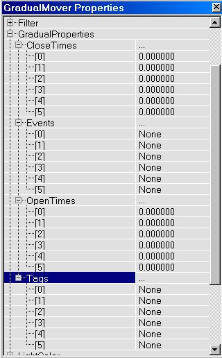 -GradualTriggerOpenTimed: this is the only InitialState that fully uses the different tags. If the mover is closed, and if Tag[0] is "A", Tag[1] is "B" and Tag[2] is "C", and the corresponding triggers have the same events, Trigger0 will make the mover go to Key1. It will wait there forever, until you activate Trigger1. Then the mover will go to Key2. This is the last key in this example, so now the mover will wait for StayOpenTime and then go back to Key0. If you use 6 different keys, you will have a mover that will only reach its last key after you activated 5 triggers in the correct order (the last key doesn't need a trigger). Plus you can use the different Events of the mover to activate other things.