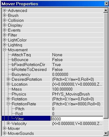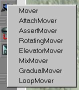 A mover is a moving brush. It can move to different locations and/or rotate around an axis. Most movers have several keys. Key0 is the begin position, the mover will wait there until it is triggered. The other keys are the locations the mover will move to when activated. It will move through all the other keys until it reaches the last one.